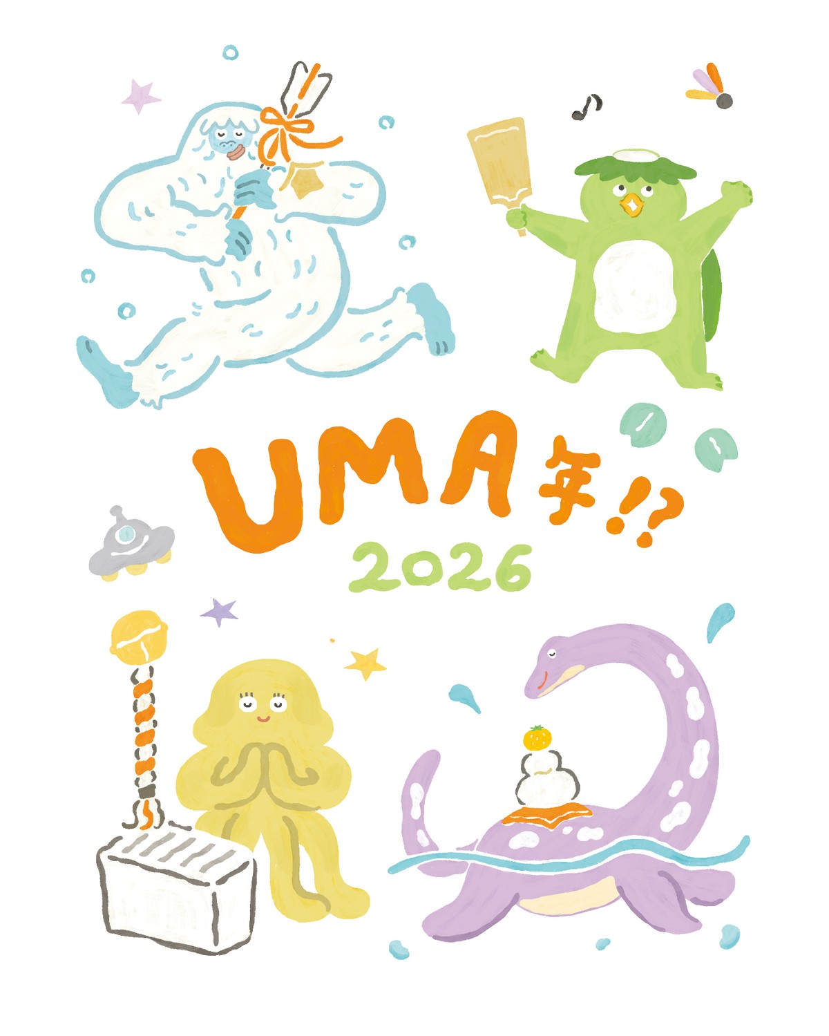 お正月を楽しむ陽気なUMAたちを描かせていただきました。